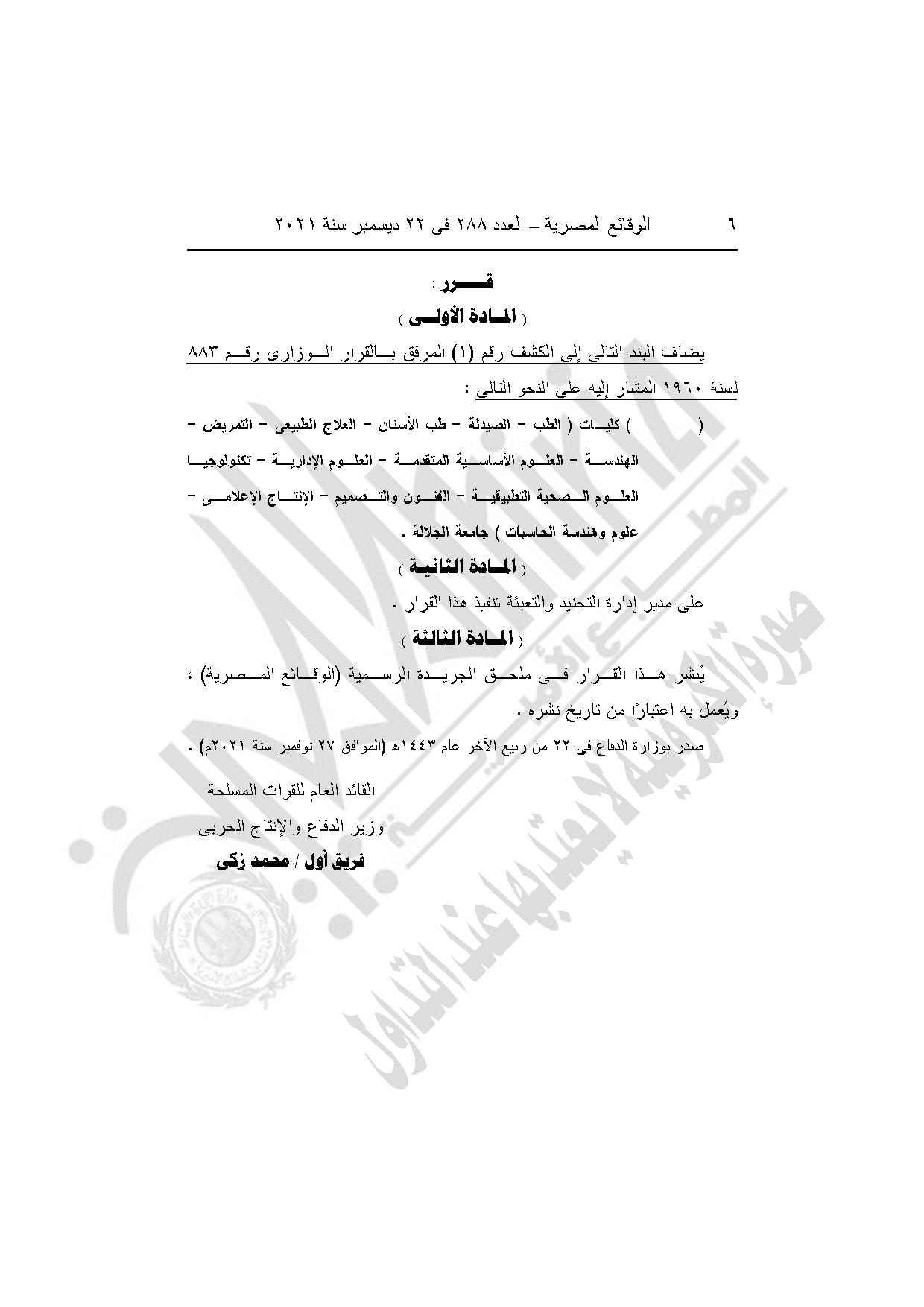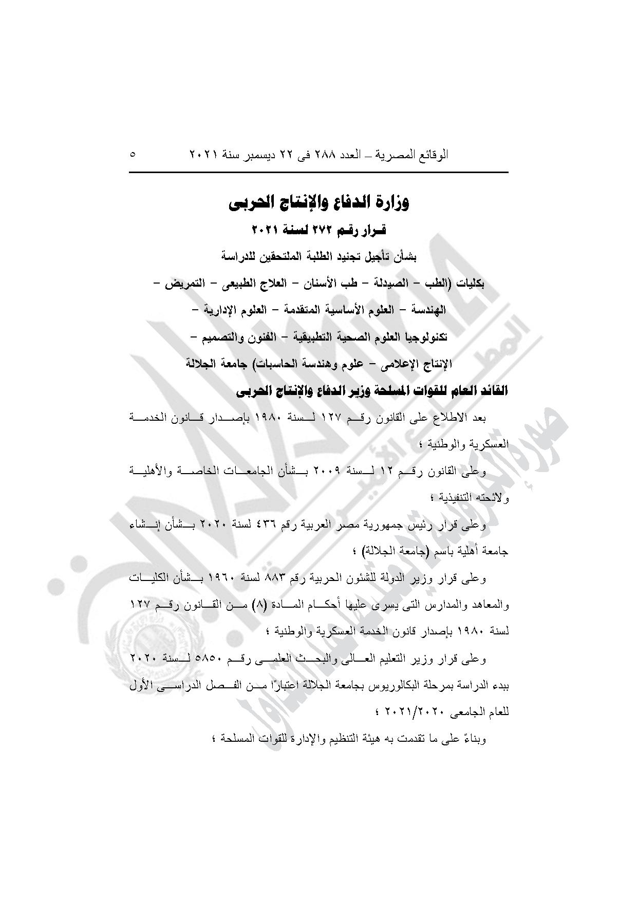 والقرار رقم 272 لسنة 2021، بشأن تأجيل تجنيد الطلبة الملتحقين للدراسة بكليات (الطب- الصيدلة- طب الأسنان- العلاج الطبيعي- التمريض- الهندسة- العلوم الأساسية المتقدمة- العلوم الإدارية- تكنولوجيا العلوم الصحية التطبيقية- الفنون والتصميم- الإنتاج الإعلامي- علوم وهندسة الحاسبات) جامعة الجلالة.
