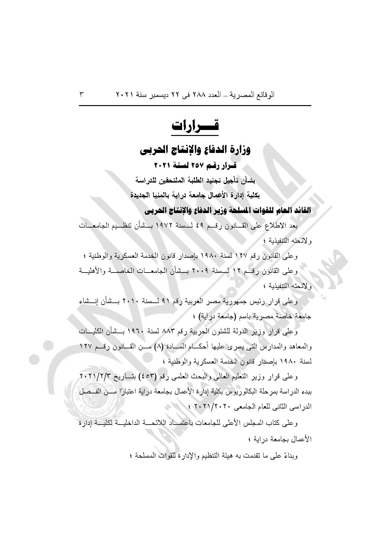 القرار رقم 257 لسنة 2021، بشأن تأجيل تجنيد الطلبة الملتحقين للدراسة بكلية إدارة الأعمال جامعة دراية بالمنيا الجديدة.