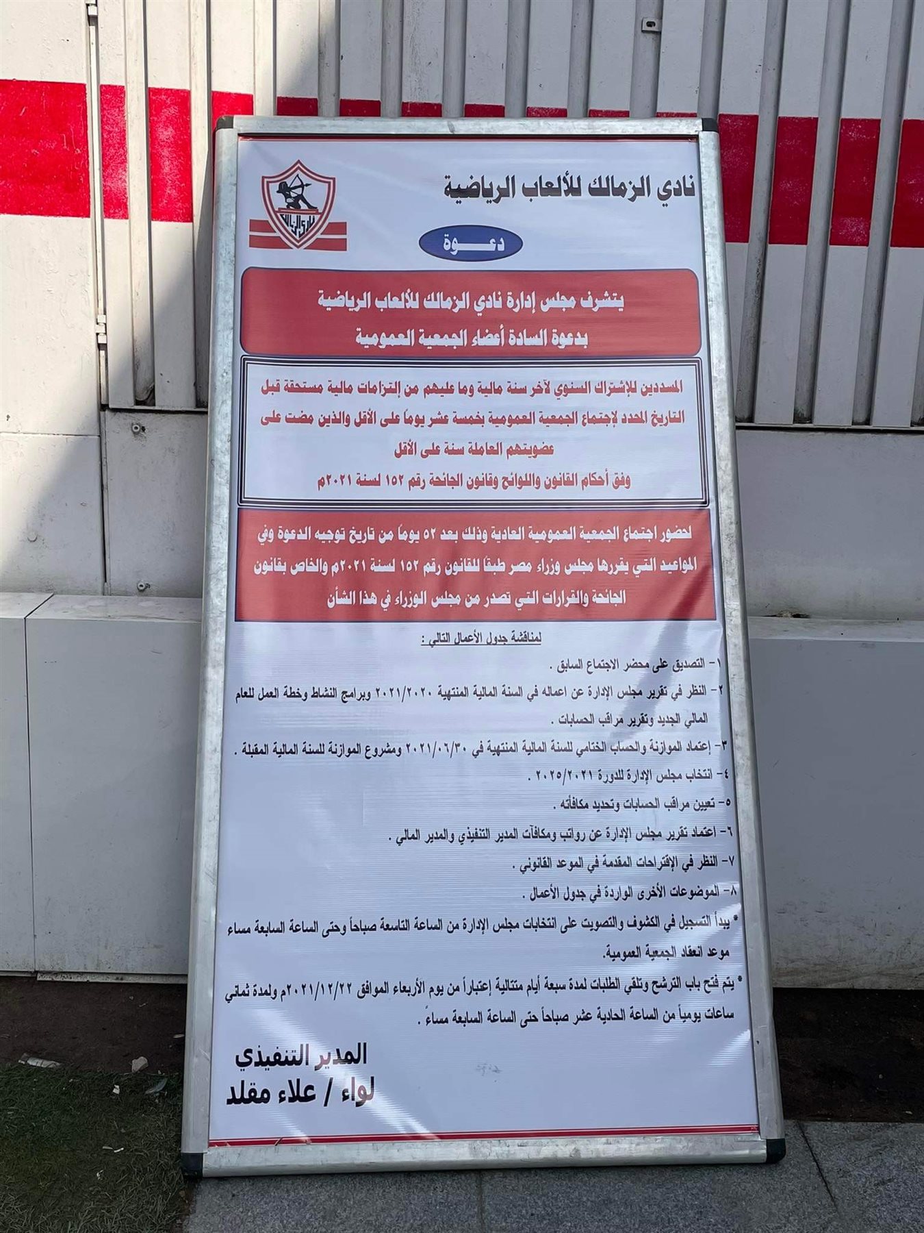 نشر مجلس إدارة نادي الزمالك برئاسة المستشار مرتضي منصور، جدول أعمال الجمعية العمومية عند مقر تلقي طلبات المرشحين.