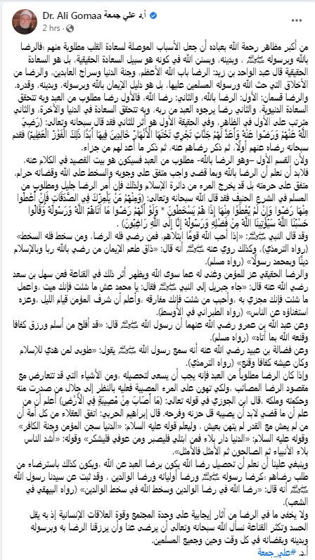 وكتب علي جمعة تدوينة على الفيس بوك قال فيها: "من أكبر مظاهر رحمة الله بعباده أن جعل الأسباب الموصلة لسعادة القلب مطلوبة منهم؛ فالرضا بالله وبرسوله ﷺ، وبدينه، وبسنن الله في كونه هو سبيل السعادة الحقيقية، بل هو السعادة الحقيقية قال عبد الواحد بن زيد: الرضا باب الله الأعظم، وجنة الدنيا وسراج العابدين، والرضا من الأخلاق التي حث الله ورسوله المسلمين عليها، بل هو دليل الإيمان بالله وبرسوله، وبدينه، وقدره".
