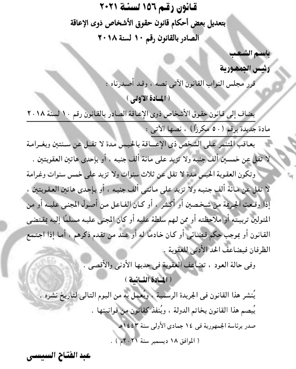 أصدر الرئيس عبدالفتاح السيسي القانون رقم 156 لسنة 2021 بتعديل بعض أحكام قانون حقوق الأشخاص ذوي الإعاقة الصادر بالقانون رقم 10 لسنة 2018.