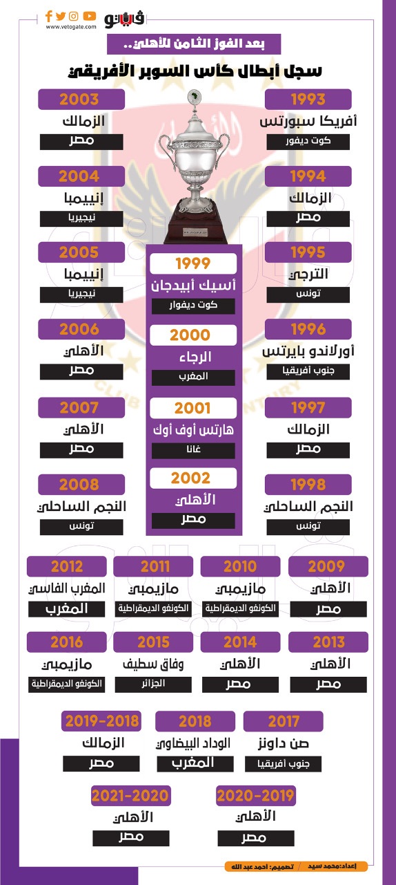 بعد الفوز الثامن للأهلي.. سجل أبطال كأس السوبر الأفريقي | إنفوجراف الأربعاء 22/ديسمبر/2021 - 10:57 م 12/22/2021 10:57:40 PM الأهلي بطل السوبر الأفريقي 2021 محمد سيد شارك طباعة 18 حجم الخط شارك طباعة الأهلي الزمالك النجم الساحلى مازيمبي كأس السوبر الأفريقي أفريكا سبورت المغرب الفاسي اورلاندو بايرتس اسيك ابيدجان هآرتس أوف أوك