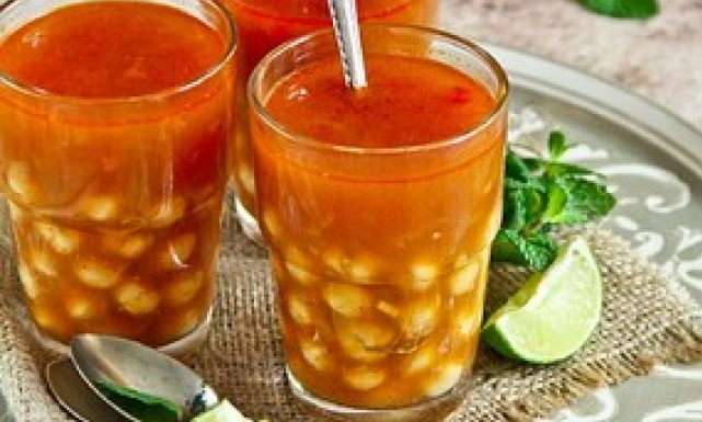 - وبعد تمام نضج الحمص، نضيف له عصير الطماطم والبصل، ونترك الخليط على النار يغلى جيدا.