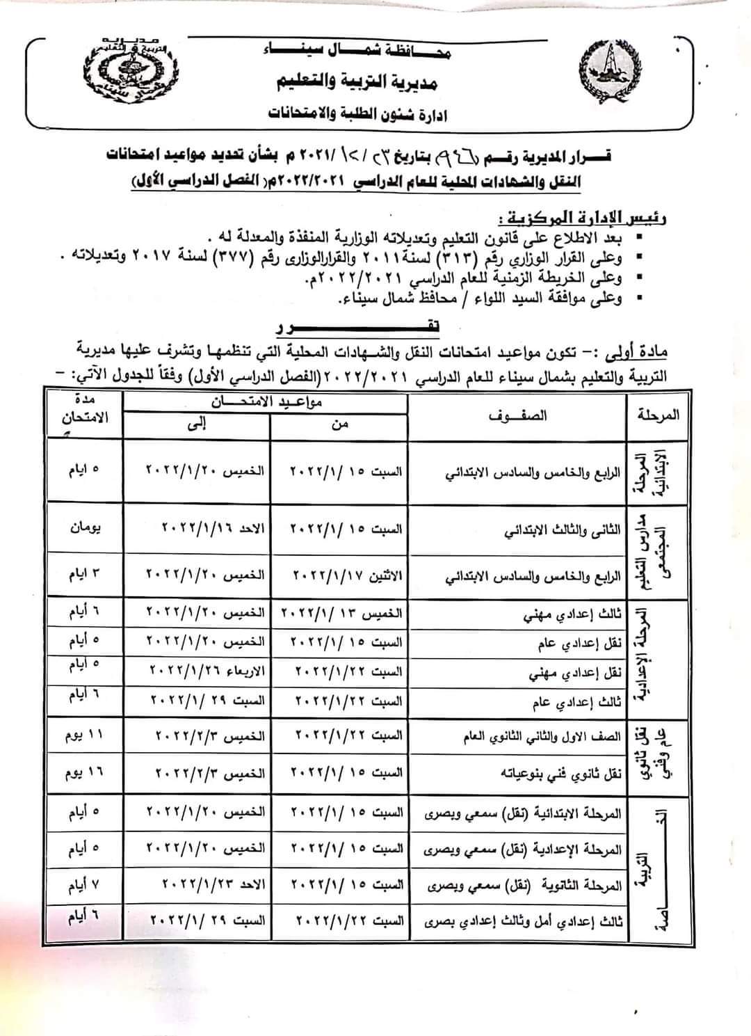 أعلنت مديرية التربية والتعليم بشمال سيناء عن جدول امتحانات نصف العام الدراسي الأول للنقل والشهادات المحلية.