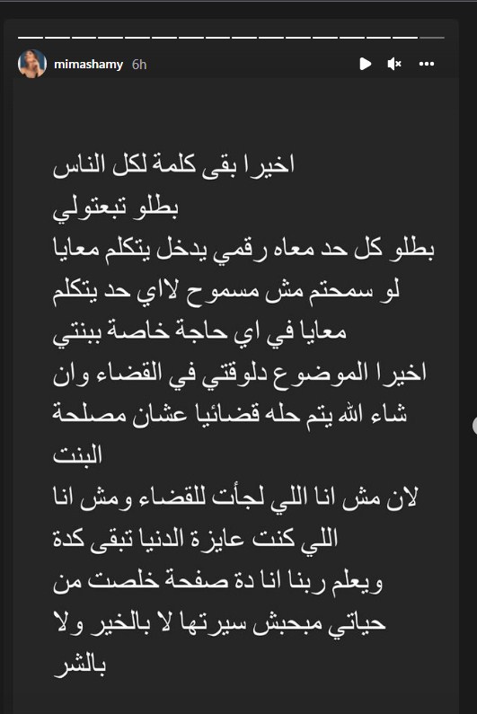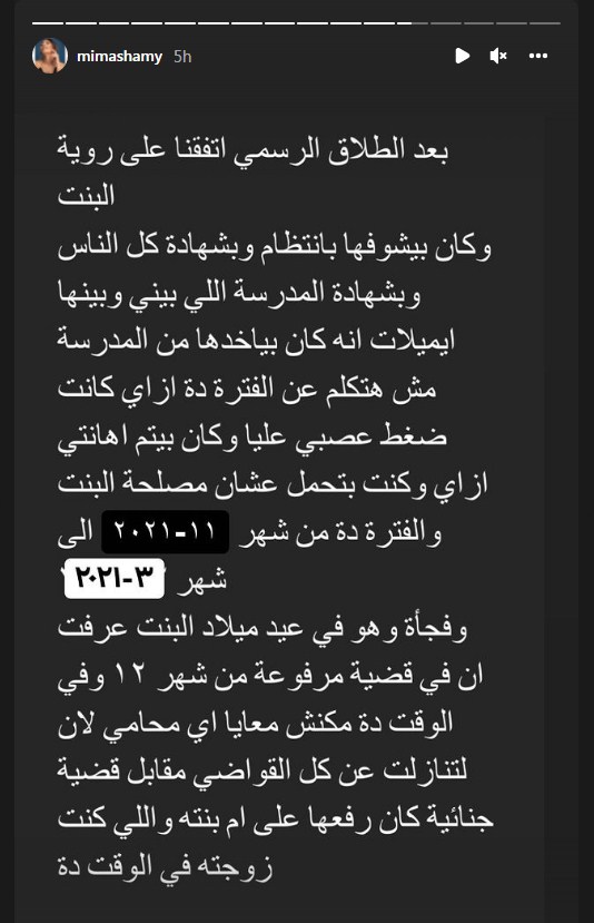 وأوضحت ميما الشامي أن الموضوع "فيه تفاصيل كثيرة"، وأن طليقها خالد عليش تحدث مع أمهات أصدقاء طفلتها ميما في المدرسة، قائلة إنها لا تعارض في رؤية طليقها لابنته الصغيرة.
