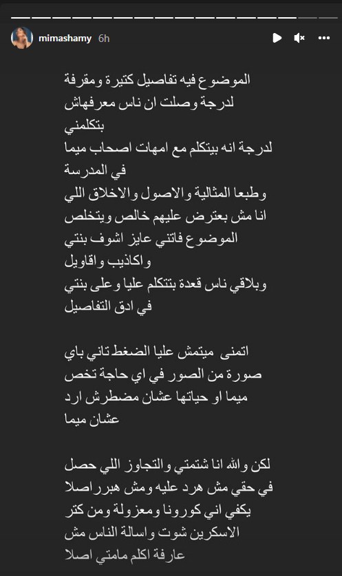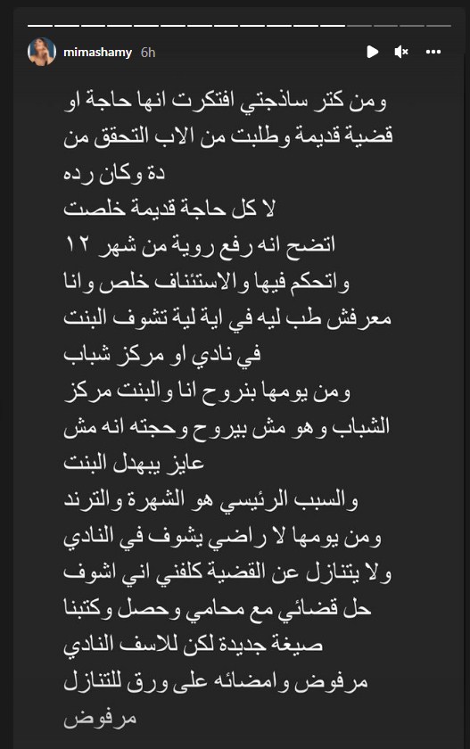 وتابعت ميما الشامي: "والنتيجة اللي بتتقال وبتزل صور قديمة للبنت، وقد ايه نفسه يشوفها ومش عارف وانا كلامي تعالي النادي أو تعالي عند ماما وهات ما يثبت برؤية البنت.. للعلم شافها أكثر من مرة في النص من غير ورق ومن غير نادي، اخرهم أول ما رجع من السفر وما ردتش اعترض، مع خوفي الشديد من الفيروس المحتمل يكون حامله وهو راجع من جنوب افريقيا".