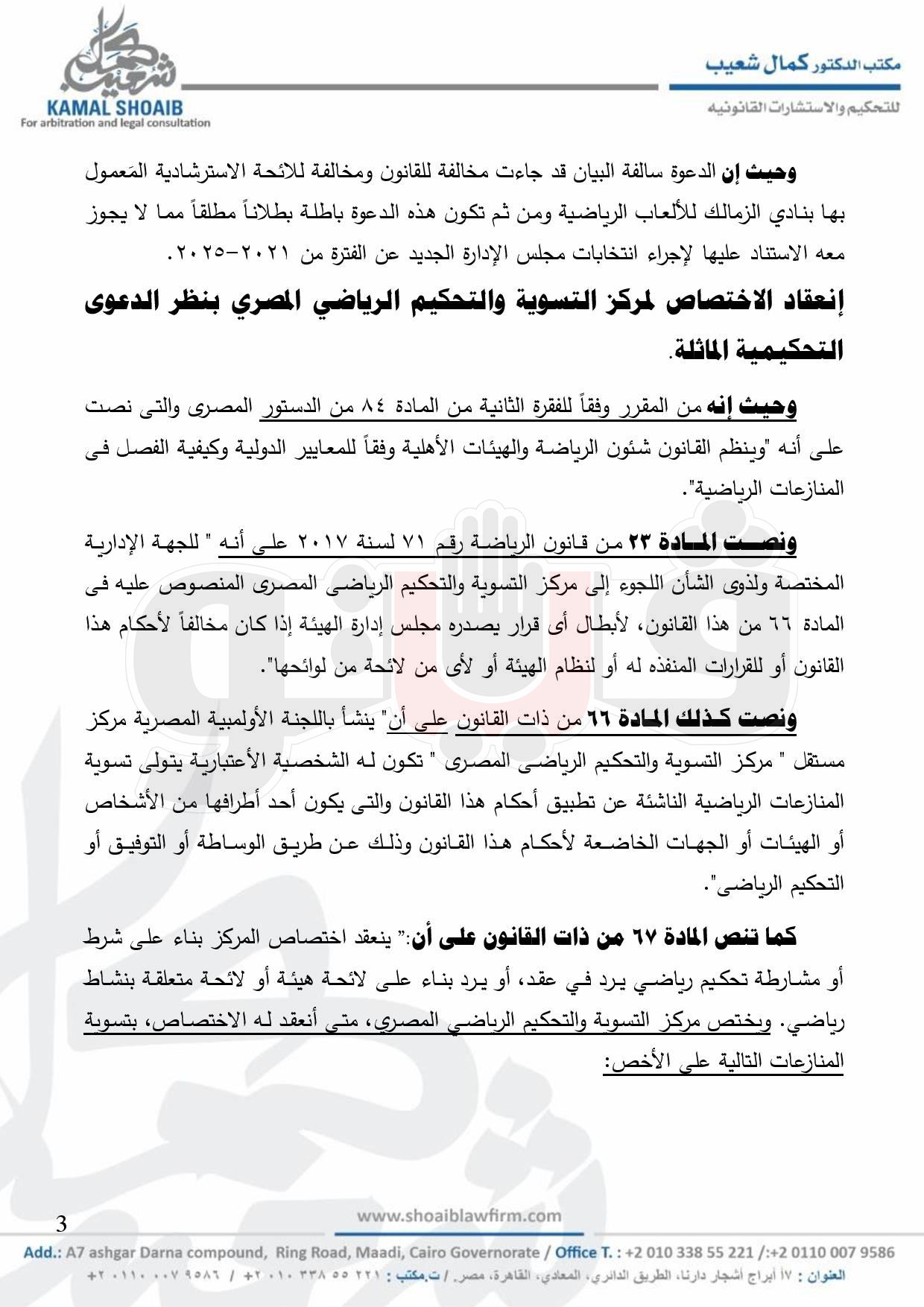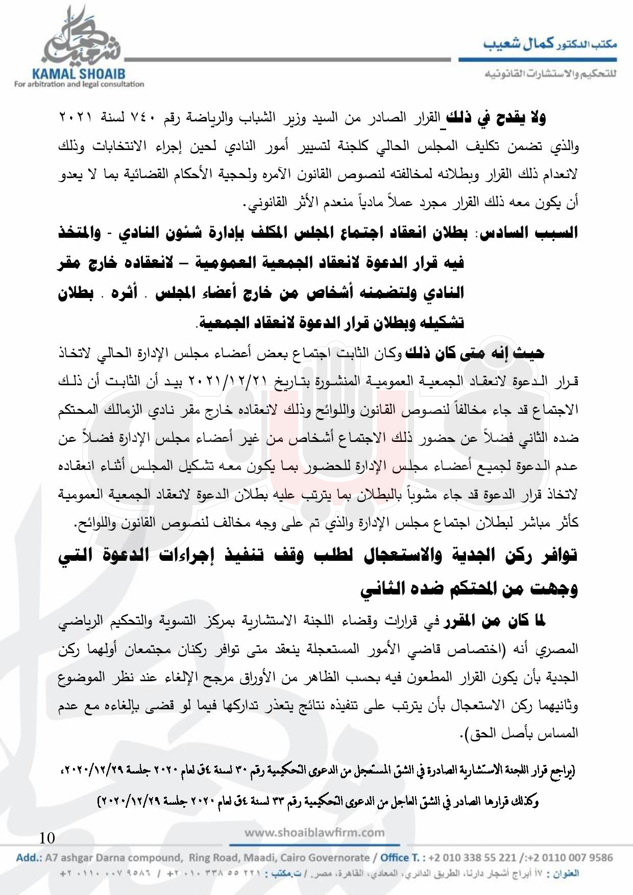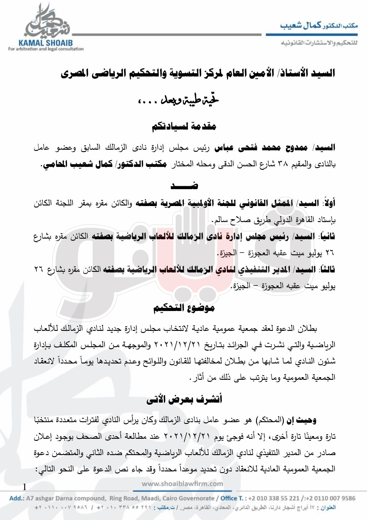 اقام ممدوح عباس رئيس نادي الزمالك السابق طعنا بمركز التسوية والتحكيم الرياضية لبطلان الدعوة لعقد جمعية عمومية عادية لانتخاب مجلس إدارة جديد لنادي الزمالك والموجهة من المجلس المكلف بإدارة النادي.