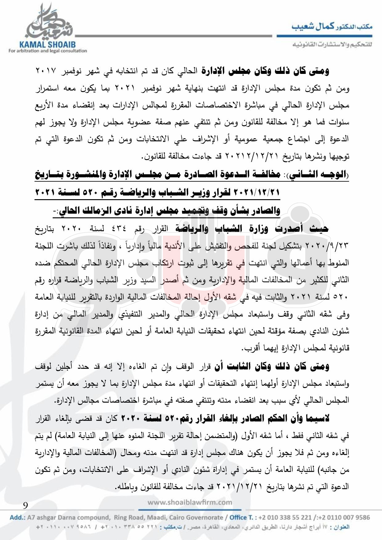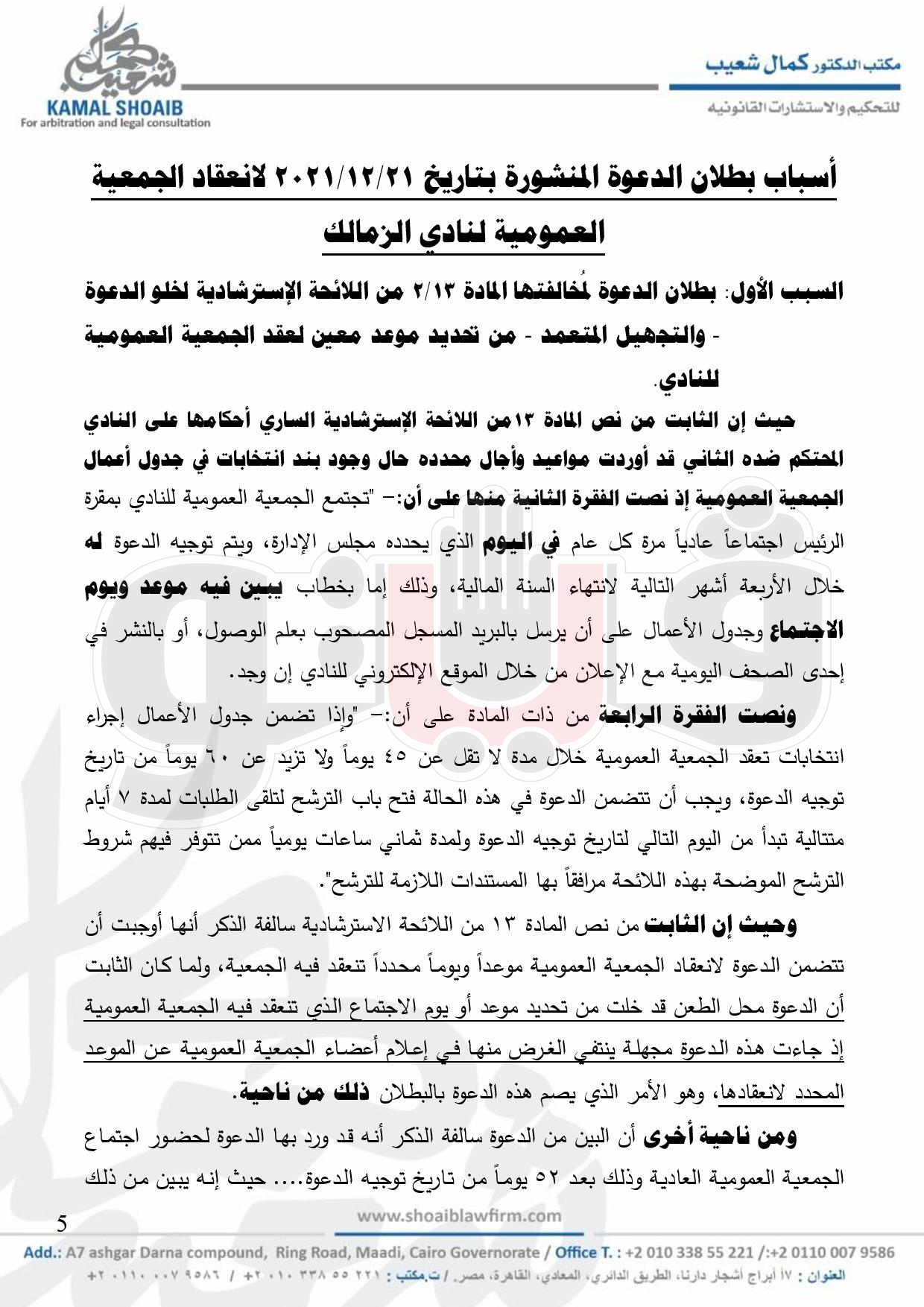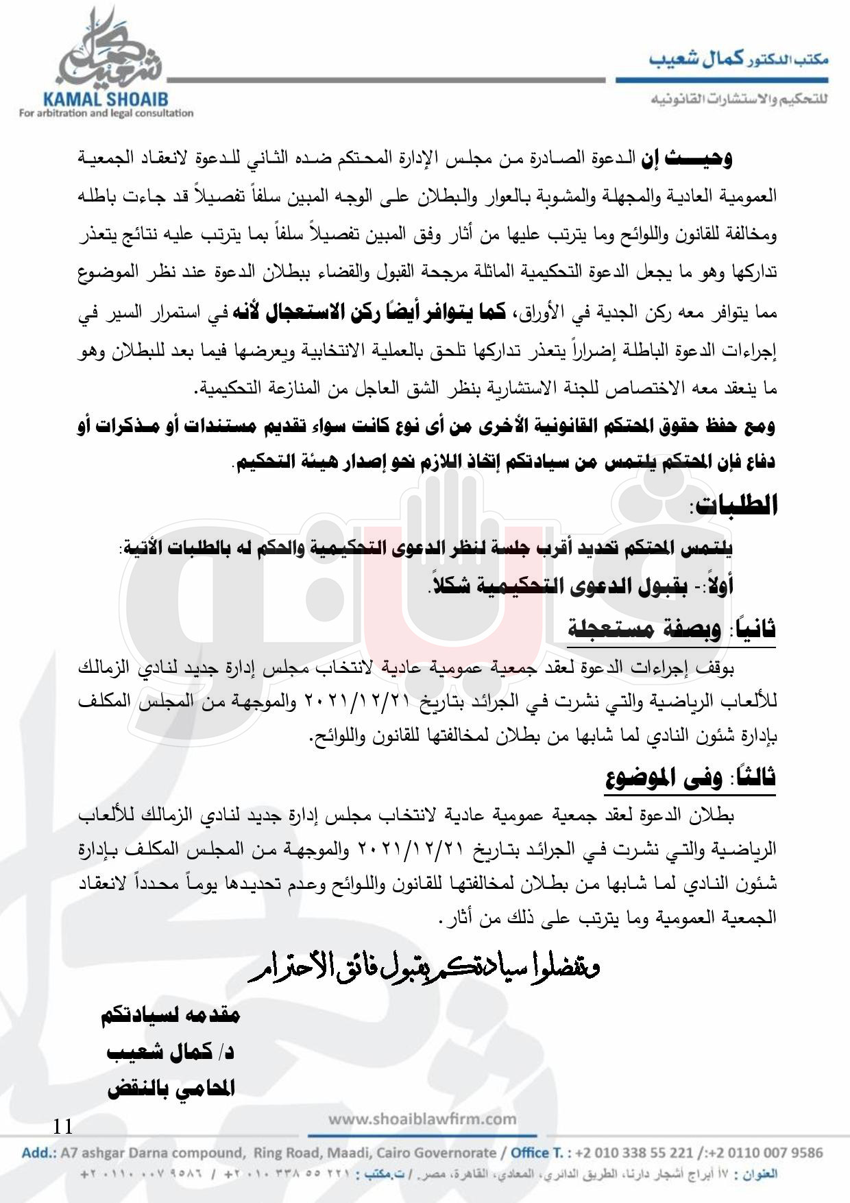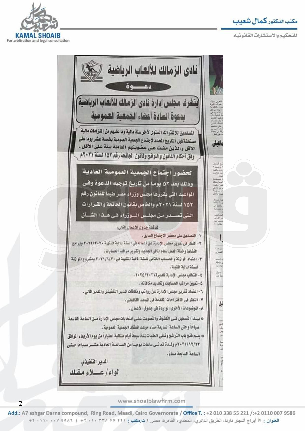 وكان مجلس إدارة الزمالك برئاسة المستشار مرتضى منصور وجه الدعوة إلى أعضاء الجمعية العمومية المسددين للاشتراك السنوى لآخر سنة مالية وما عليهم من التزامات مالية مستحقة قبل التاريخ المحدد لاجتماع الجمعية العمومية بخمسة عشر يوما على الأقل والذين مضت على عضويتهم العاملة سنة على الأقل وفق أحكام القانون واللوائح وقانون الجائحـة رقـم 152 لسنـة 2021 لحضور اجتماع الجمعية العمومية العادي والذي سيتم خلاله مناقشة جدول الأعمال الذي يتضمن التصديق على محضر الاجتماع السابق، النظر فى تقرير مجلس الإدارة عن أعماله فى السنة المالية المنتهية 2020/2021 وبرامج النشاط وخطة العمل للعام المالي الجديد وتقرير مراقب الحسابات، اعتماد الموازنة والحساب الختامى للسنة المالية المنتهية فى 30 /6 /2021 ومشروع الموازنة للسنة المالية المقبلة، انتخاب مجلس الإدارة للدورة 2021 /2025، تعيين مراقب الحسابات وتحديد مكافآته، اعتماد تقرير مجلس الإدارة عن رواتب ومكافآت المدير التنفيذي والمدير المالي، النظر فى الاقتراحات المقدمة في الموعد القانوني، الموضوعات الأخرى الواردة في جدول الأعمال.
