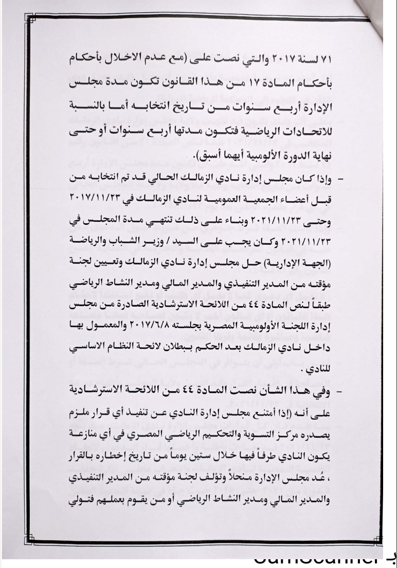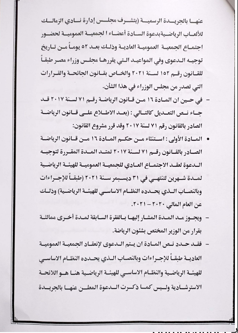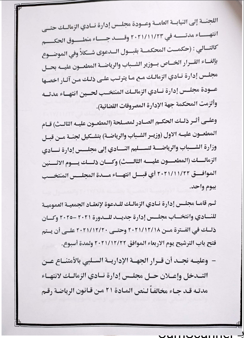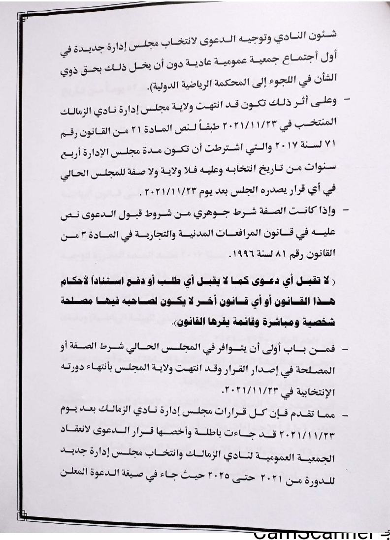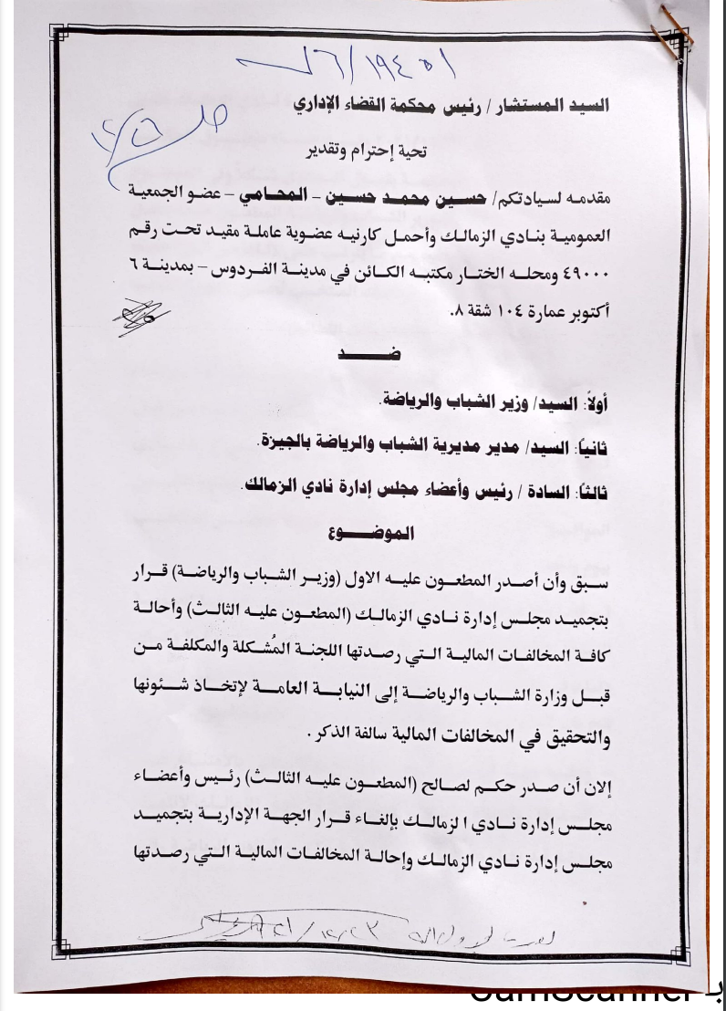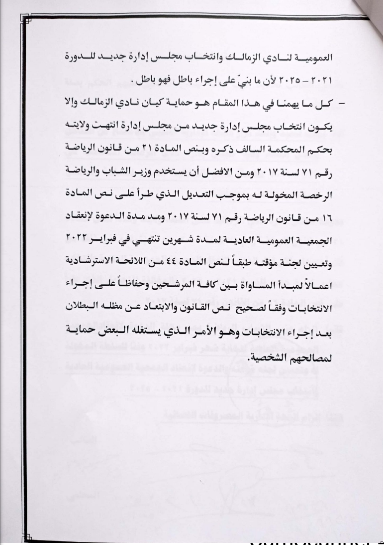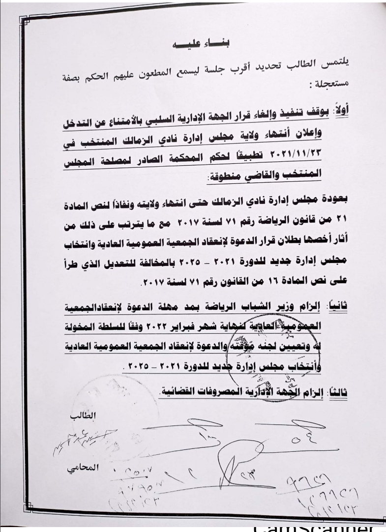 أقام حسين محمد حسين المحامي وعضو الجمعية العمومية لنادي الزمالك، دعوي قضائية أمام محكمة القضاء الإدارى بمجلس الدولة، والتى طالب فيها بإعلان انتهاء ولاية مجلس نادي الزمالك المنتخب فى ٢٣ نوفمبر الماضي طبقٱ لحكم المحكمة،مع الزام وزير الشباب والرياضة بمد الإنتخابات لشهر نوفمبر ٢٠٢٢،وتعيين لجنة مؤقته لإدارة النادي.
