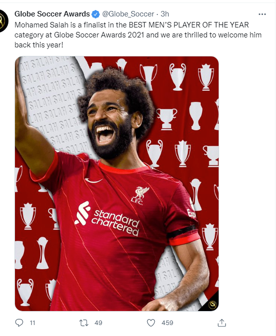 وكتب الصفحة الرسمية لجائزة جلوب سوكر عبر موقع التواصل الاجتماعي تويتر: "وصل محمد صلاح إلى النهائي في فئة أفضل لاعب في العام في حفل توزيع جوائز جلوب سوكر 2021، ويسعدنا أن نرحب به مرة أخرى هذا العام".
