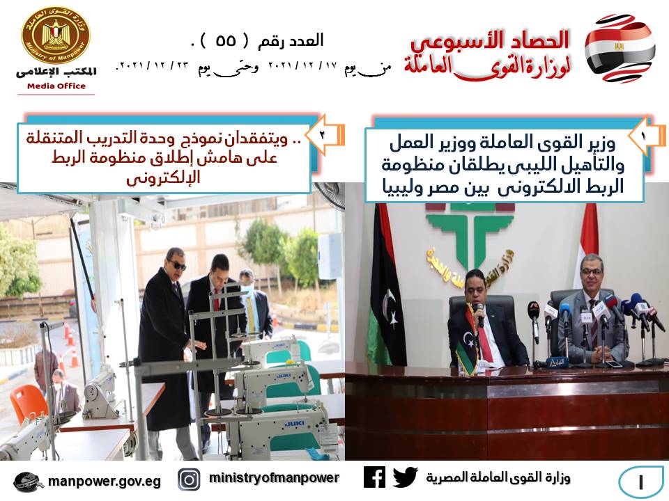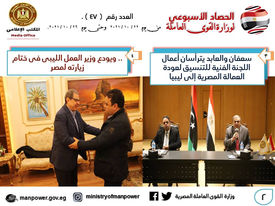 وفيما يلي تفاصيل ما جاء بالحصاد الأسبوعي، حيث ترأس وزير القوى العاملة محمد سعفان، ووزير العمل والتأهيل الليبي علي العابد الرضا، إجتماع اللجنة الفنية المصرية-الليبية بالقاهرة للتنسيق لعودة العمالة المصرية إلى ليبيا للمشاركة في إعادة إعمارها، وذلك في إطار البروتوكول الموقع للربط الإلكتروني بين الدولة المصرية وشقيقتها الليبية لتسهيل تنقل القوى العاملة وفقا لما اتفق عليه في مذكرة التفاهم الموقعة بين الوزارتين.