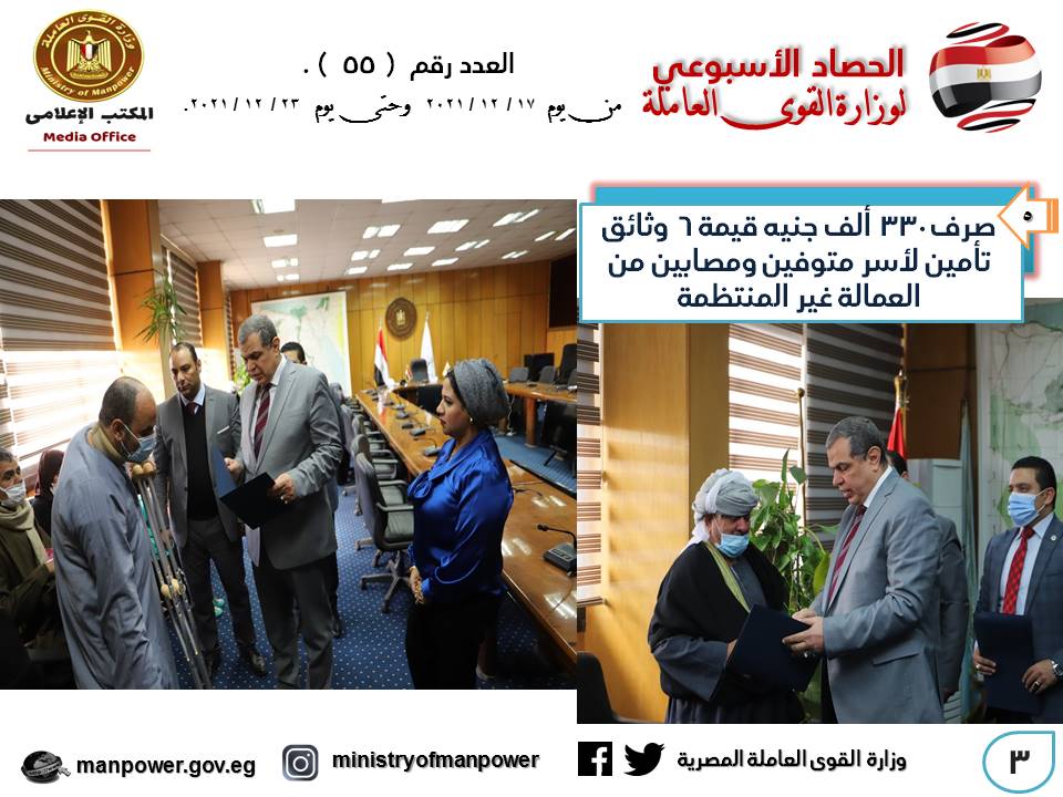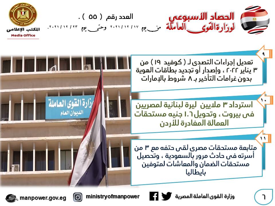 كما شمل الحصاد، نجاح مكتب التمثيل العمالي التابع للوزارة بالسفارة المصرية بعمان-الأردن، بالمتابعة اللحظية والجهود المبذولة والمقابلات مع المسئولين بمؤسسة الضمان الاجتماعي بالأردن، واستكمالا لما تم تحويله سابقا، تم تحويل القائمة الـ 61 من مستحقات الضمان الاجتماعي لنحو 52 عامل مصري لدى المؤسسة غادروا عمان نهائيا.