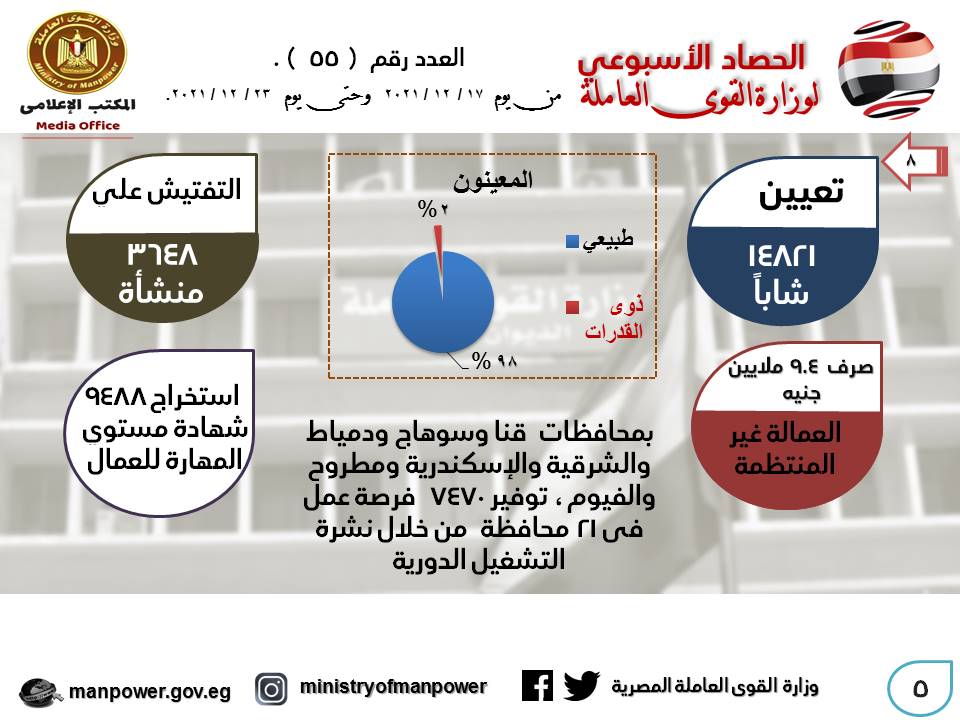 وشمل حصاد الأسبوع تعيين 14 الفًا و821 شابًا في 7 محافظات، وصرف منح للرعاية الاجتماعية والصحية للعمالة غير المنتظمة المسجلة بمديريات القوى العاملة بمحافظة الإسكندرية، وسوهاج، وقنا، والفيوم، ومطروح، والشرقية، ودمياط، بلغت 9 ملايين و460 ألفًا و949 جنيه، والتفتيش على 3648 منشأة لتطبيق أحكام القانون، فضلًا عن إستخراج 9488 شهادة قياس مستوى المهارة، ورخصة مزاولة الحرفة لـ 9488 عاملا.