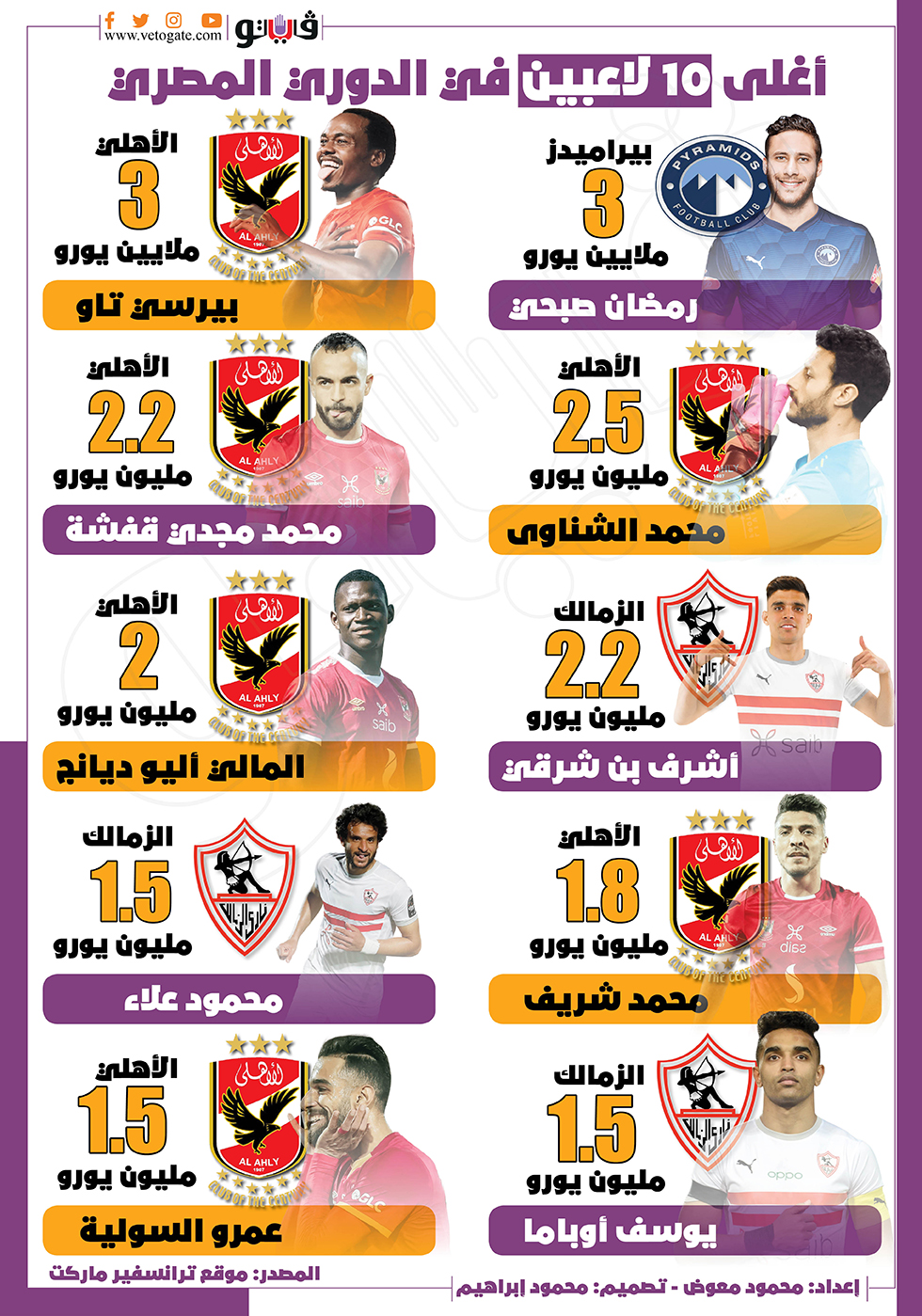 أغلى 10 لاعبين في الدوري المصري| انفوجراف السبت 25/ديسمبر/2021 - 12:38 م 12/25/2021 12:38:57 PM رمضان صبحي محمود معوض شارك طباعة 18 حجم الخط شارك طباعة الزمالك الأهلي بيراميدز أندية الدوري المصري ارقام رمضان صبحي