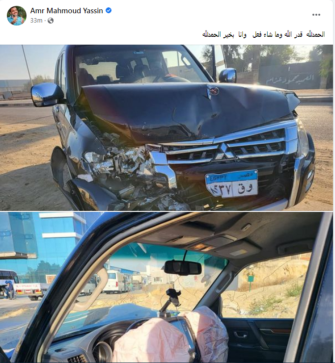 ونشر عمرو محمود ياسين صور لسيارته بعد الحادث معلقا عليها قائلا: "الحمدلله قدر الله وما شاء فعل وأنا بخير الحمد لله".