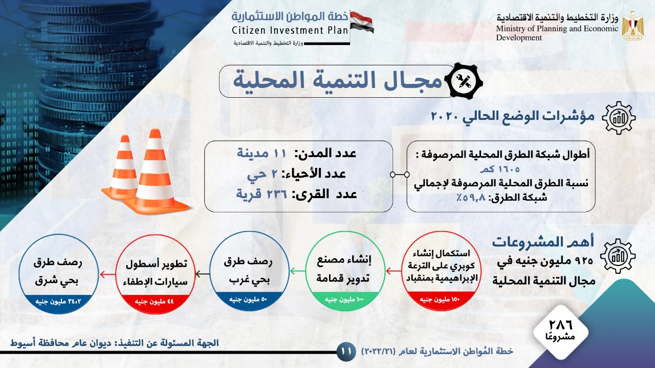 أعلنت وزارة التخطيط والتنمية الاقتصادية في تقرير صادر عنها ملامح خطة المواطن الاستثمارية لمحافظة أسيوط لعام 21/ 2022، وذلك في إطار مواصلة الإعلان عن خطة المواطن في كافة محافظات الجمهورية للعام الثالث على التوالي، بهدف توعية المواطنين بشأن توجهات وأولويات خطة التنمية المستدامة للعام المالي (21/2022)، ودورها في تحقيق "رؤية مصر 2030".
