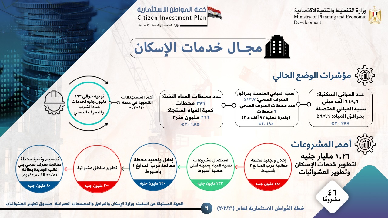 وأوضح تقرير وزارة التخطيط والتنمية الاقتصادية أن أهم المستهدفات التنموية بقطاع الإسكان وتطوير العشوائيات بمحافظة أسيوط في خطة 21/2022 تتمثل في توجيه حوالي 993 مليون جنيه لخدمات مياه الشرب والصرف الصحي.