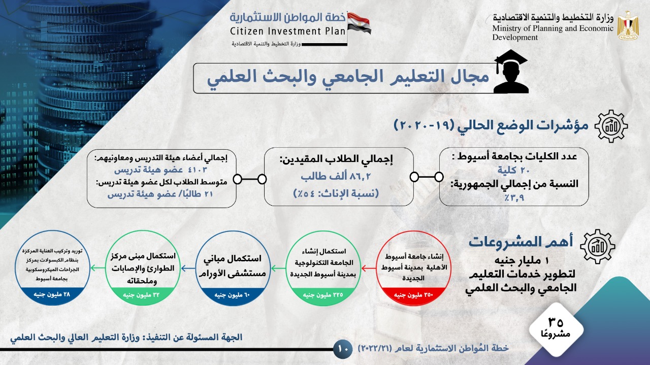 وفي مجال التعليم الجامعي والبحث العلمي فإن أهم المشروعات وفقا للتقرير تتمثل في إنشاء جامعة أسيوط الأهلية بمدينة أسيوط الجديدة، استكمال إنشاء الجامعة التكنولوجية بمدينة أسيوط الجديدة، استكمال مباني مستشفى الأورام الجديدة، إلى جانب استكمال مبنى مركز الطواريء والإصابات وملحقاته، فضلا عن توريد وتركيب العناية المركزة بنظام الكبسولات بمركز الجراحات الميكروسكوبية بجامعة أسيوط.