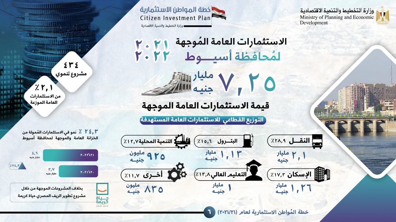 التخطيط: 7،25 مليار جنيه قيمة الاستثمارات العامة الموجهة لمحافظة أسيوط