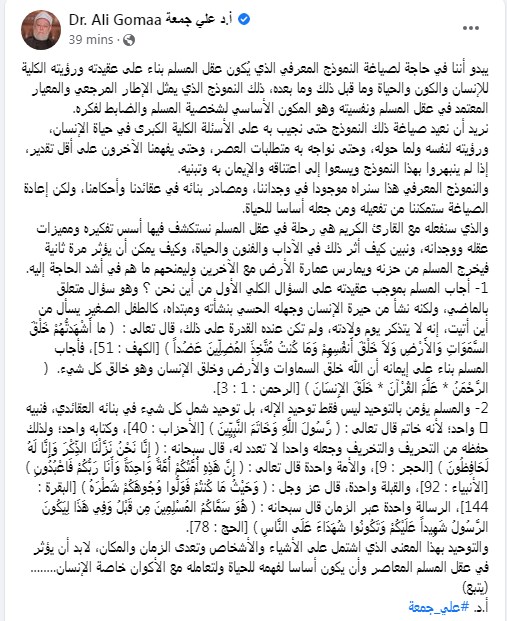 وكتب علي جمعة تدوينة على الفيس بوك: "يبدو أننا في حاجة لصياغة النموذج المعرفي الذي يُكون عقل المسلم بناء على عقيدته ورؤيته الكلية للإنسان والكون والحياة وما قبل ذلك وما بعده، ذلك النموذج الذي يمثل الإطار المرجعي والمعيار المعتمد في عقل المسلم ونفسيته وهو المكون الأساسي لشخصية المسلم والضابط لفكره".