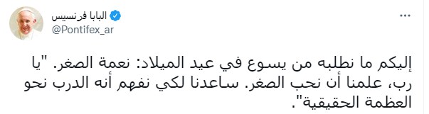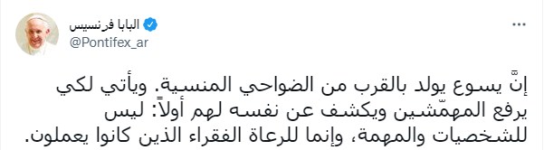 وكتب بابا الفاتيكان تغريدة على تويتر "إنَّ يسوع يولد بالقرب من الضواحي المنسية ويأتي لكي يرفع المهمّشين ويكشف عن نفسه لهم أولًا: ليس للشخصيات والمهمة، وإنما للرعاة الفقراء الذين كانوا يعملون"
