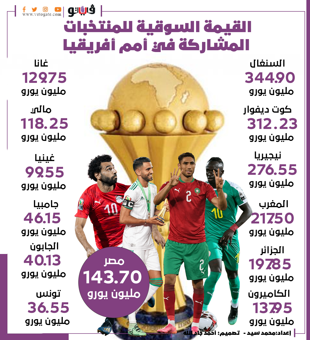 القيمة السوقية للمنتخبات المشاركة في أمم أفريقيا | انفوجراف الإثنين 10/يناير/2022 - 10:50 ص 1/10/2022 10:50:54 AM كأس أمم أفريقيا محمد سيد شارك طباعة 18 حجم الخط شارك طباعة الجزائر تونس مصر المغرب الكاميرون غانا مالي نيجيريا غينيا أمم إفريقيا