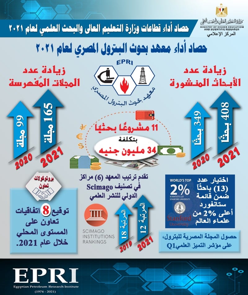 وأشار التقرير إلى حصول المجلة المصرية للبترول، على مؤشر التميز العلميQ1، حيث حصلت المجلة على المركز الأول في 3 مجالات علمية مُختلفة «الكيمياء والطاقة والهندسة الكيميائية» على مستوى الشرق الأوسط، بالأَضافة الي تقدم ترتيب المعهد 6 مراكز في تصنيف Scimago الدولي للنشر العلمي، ليُصبح في المرتبة الـ12 مقارنةً بالمرتبة الـ(18) في تصنيف عام 2019.