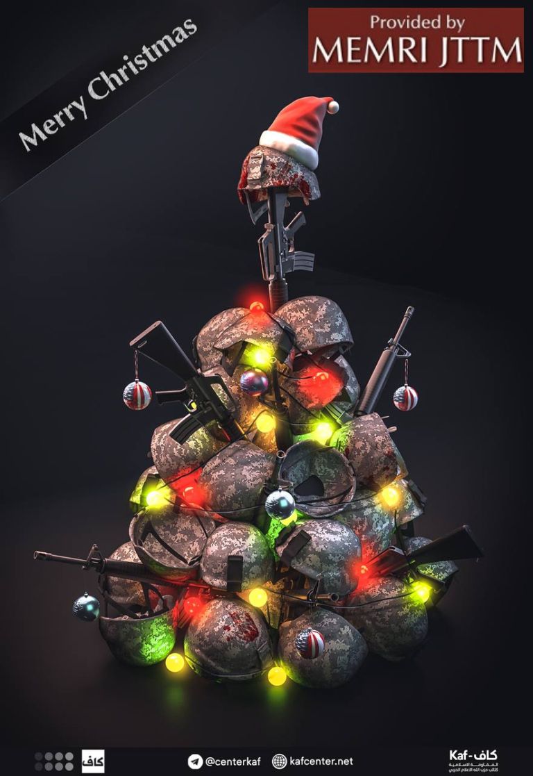 ويُظهر الملصق بابا نويل مقطوع الرأس وعليه رسالة تقول: "نبعث برسالة إلى إخواننا الموحدين في أوروبا وأمريكا وأستراليا وكندا وروسيا ودول أخرى من الكفر والردة. نقول لكم أيها الاخوة الموحدون انتقموا لأخوتكم وأخواتكم الذين قتلوا وأسروا من قبل هؤلاء الحثالة".
