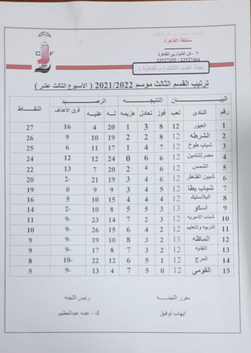 اعتمدت لجنة مسابقات المجموعة السادسة لمسابقة دوري القسم الثالث بالقاهرة جدول ترتيب المجموعة بعد نهاية الأسبوع الثالث عشر للمسابقة