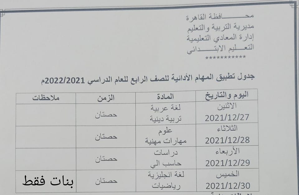 وأعلنت مدارس المرحلة الابتدائية بمحافظة القاهرة أن جدول تطبيق المهام الأدائية لتلاميذ الصف الرابع الابتدائي يبدأ يوم 27 ديسمبر وينتهي يوم 30 ديسمبر وهو كالتالي: