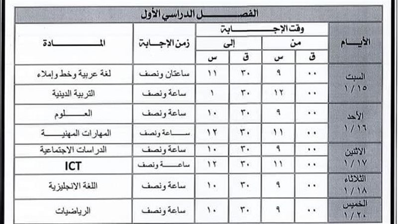 جدول امتحانات الصف الرابع الابتدائي بالإسماعيلية
