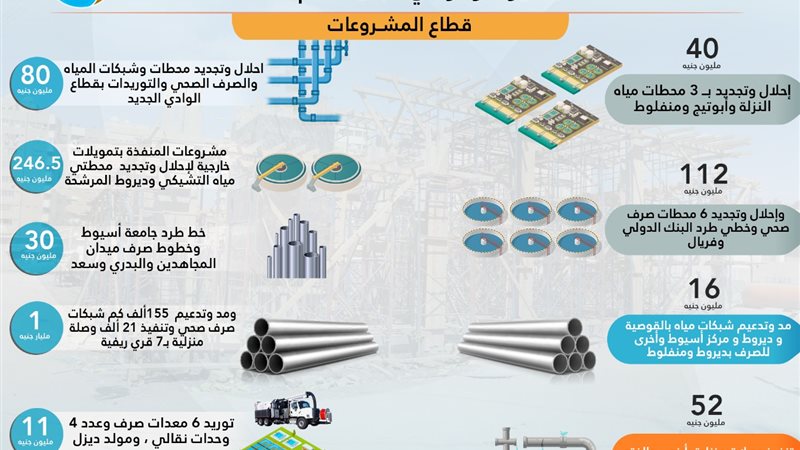 و تابع أنه تم تخصيص مبلغ 2.7 مليار جنيها لعمل توسعات وإنشاء وإعادة تأهيل لـ7 محطات مرشحة بعدد 7 مراكز، ومد وتدعيم 444 كم شبكات مياه، و28 كم صرف وإحلال وتجديد 264 كم أخرى، وعدد 30 بئر وتنفيذ 24 ألف وصلة منزلية، وتوريد 245 جهاز قياس، ووحدتا معالجة الأملاح، ومد خدمات المياه والصرف الصحي لمحافظة الوادي الجديد بتكلفة 120 مليون جنيها.