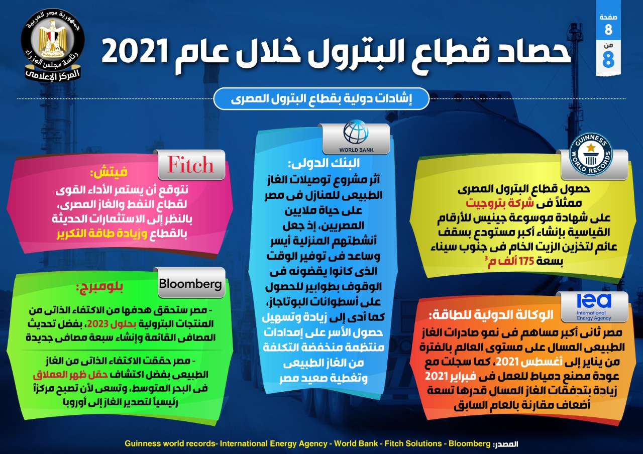 وفي إطار سلسلة تقارير حصاد قطاعات الدولة في عام 2021، نشر المركز الإعلامي لمجلس الوزراء تقريرًا تضمن إنفوجرافات تسلط الضوء على حصاد قطاع البترول.