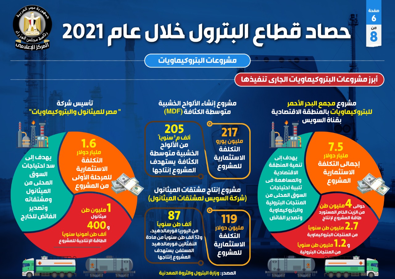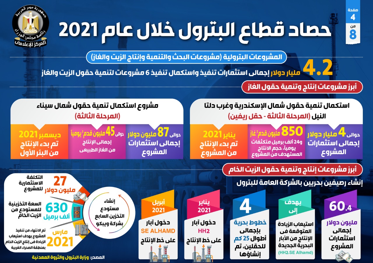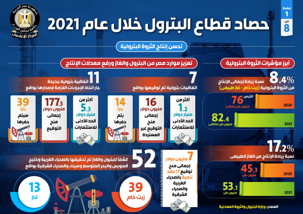 وفي إطار سلسلة تقارير حصاد قطاعات الدولة في عام 2021، نشر المركز الإعلامي لمجلس الوزراء تقريرًا تضمن إنفوجرافات تسلط الضوء على حصاد قطاع البترول.