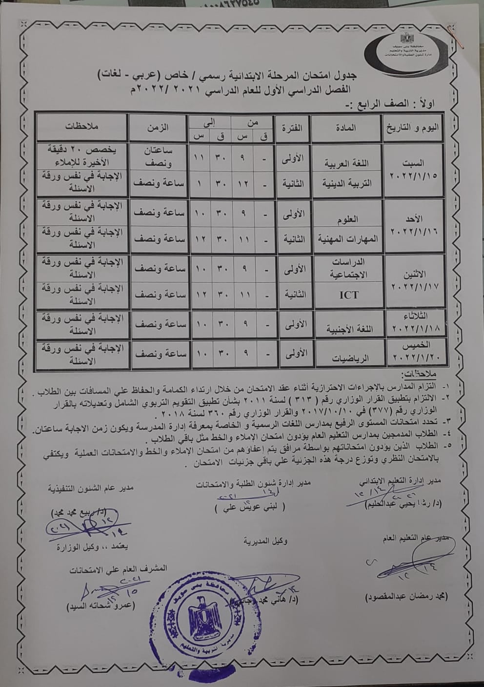 أعلنت مديرية التربية والتعليم بـ محافظة بني سويف، عن جدول امتحانات الصف الرابع الابتدائي، حيث تبدأ امتحانات الترم الثاني للصف الرابع الابتدائي، يوم ١٥ من شهر يناير وتستمر حتى يوم ٢٠ من يناير المقبل.