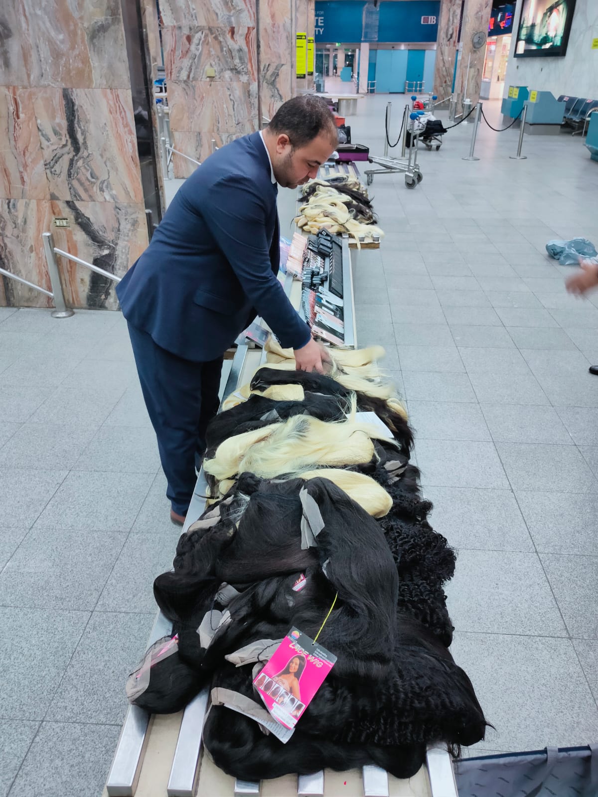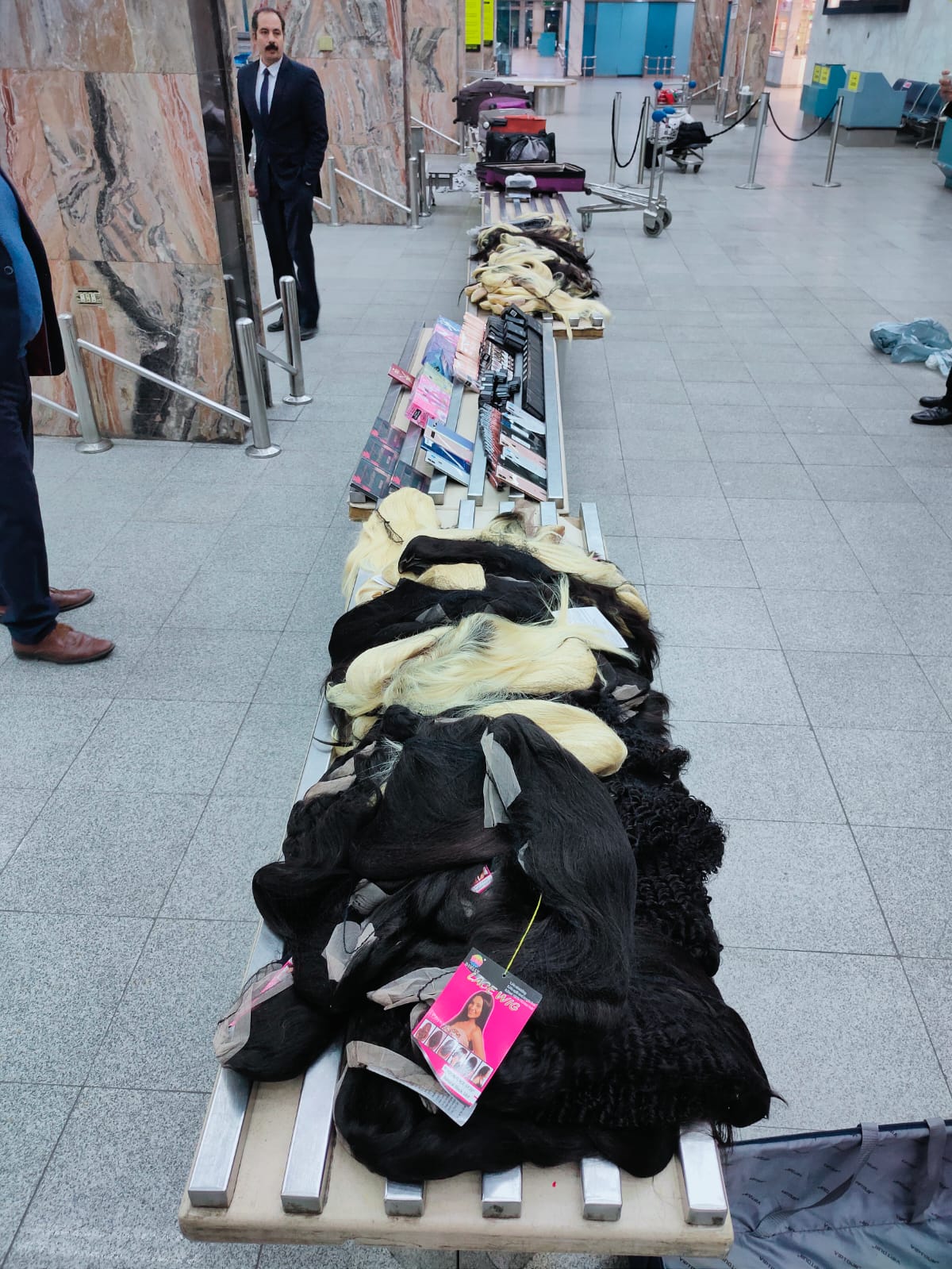 وبتمرير حقائبة علي جهاز الفحص بالأشعة بواسطة مينا فهيم مأمور الفحص، تلاحظ له وجود كثافات متماثلة وسط الملابس بحقائب الراكب، وبالعرض على مدحت عبدالصبور مدير الإدارة بالإنابة، قرر تشكيل لجنة من عبدالقوى عزوز وحسام محمد سليمان مأمورى الجمرك، وأحمد عاطف مدير الحركة المشرف على صالة الوصول بمبني الركاب، لتفتيش حقائب الراكب وتفتيشه ذاتيا فتبين وجود 40 كيلو جرام من خصل الشعر الطبيعي والبواريك و80 شيشة إلكترونية و133عبوة مستحضرات تجميل أسفل الملابس بحقائب الراكب ووجود 12 هاتف محمول ماركة آيفون وسامسونج مخبأة داخل جيوب الجاكت الخاص بالراكب، وتقدر قيمة المضبوطات ب 600 ألف جنية مصرى.
