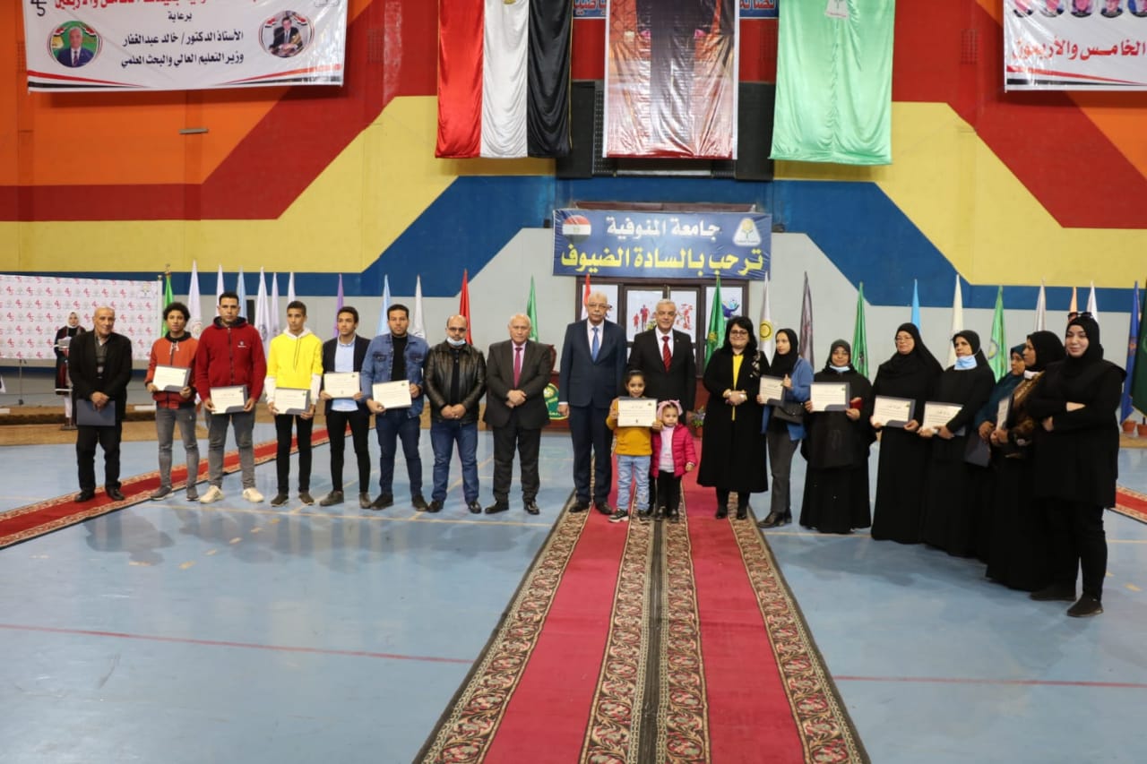 شهد الدكتور عادل مبارك رئيس جامعة المنوفية فعاليات اليوم الثانى للإحتفال بعيد الجامعة الخامس والأربعين بحضور نائباه الدكتور أحمد القاصد للدراسات العليا والبحوث، والدكتور نانسى للتعليم والطلاب والمحاسب جلال عبد السلام أمين عام الجامعة والذى أقيم بالصالة المغطاة باستاد الجامعة بحضور لفيف من العمداء وأعضاء الجهاز الإدارى.