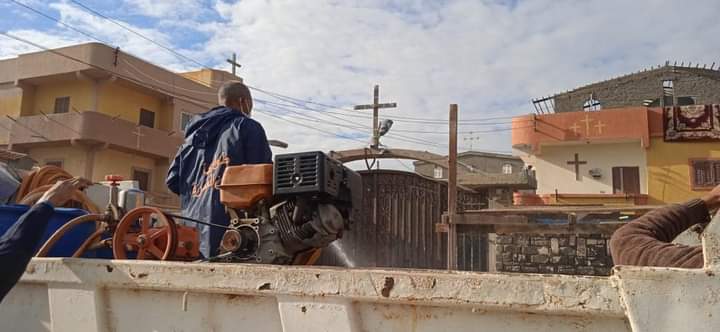 واصلت الأجهزة التنفيذية بمحافظة الإسكندرية، اليوم الإثنين، أعمال التطهير والتعقيم من أمام بعض الكنائس غرب المحافظة وذلك استعدادًا لاحتفال الإخوة الأقباط بأعياد الميلاد.