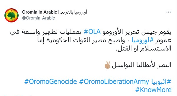 وكتبت أوروميا بالعربي، المعني بشئون قوات الأورومو، تغريدة على تويتر "يقوم جيش تحرير الأورومو #OLA بعمليات تطهير واسعة في عموم #اوروميا، واصبح مصير القوات الحكومية إما الاستسلام او القتل. النصر لأبطالنا البواسل"