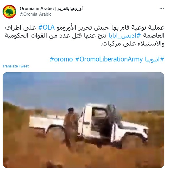 وقالت أوروميا "عملية نوعية قام بها جيش تحرير الأورومو #OLA على أطراف العاصمة #اديس_ابابا نتج عنها قتل عدد من القوات الحكومية والاستيلاء على مركبات"