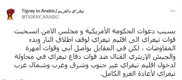 وهنا كتبت تيجراي بالعربي تغريدة قالت فيها " بسبب دعوات الحكومة الأمريكية ومجلس الامن انسحبت قوات تيغراي الى اقليم تيغراي لوقف اطلاق النار وبدء المفاوضات، لكن في المقابل يواصل آبي وقوات أمهرة والجيش الإريتري القتال ضد قوات دفاع تيغراي في محاولة لدخول اقليم تيغراي عبر جنوب وشرق وغرب وشمال غرب تيغراي لأعادة الغزو الكامل"