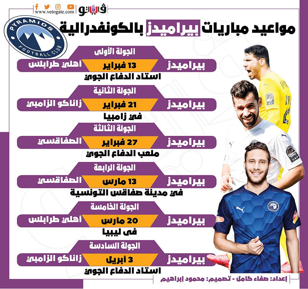 مواعيد مباريات بيراميدز بالكونفدرالية|انفوجراف الثلاثاء 28/ديسمبر/2021 - 07:04 م 12/28/2021 7:04:59 PM بيراميدز صفاء كامل شارك طباعة 18 حجم الخط شارك طباعة بيراميدز قرعة دور المجموعات من بطولة كأس الكونفدرالية كأس الكونفدرالية الكونفدرالية الصفاقسي اهلي طرابلس