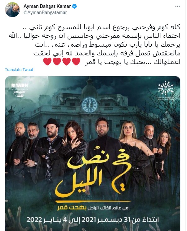 وكان أيمن بهجت قمر كتب في تدوينة سابقة قال فيها: "بسم الله، مسرحية في نص الليل من عالم الكاتب الراحل بهجت قمر، ان شاء الله ليلة رأس السنه بموسم الرياض على مسرح محمد العلي- برعاية هيئة الترفيه السعوديه".