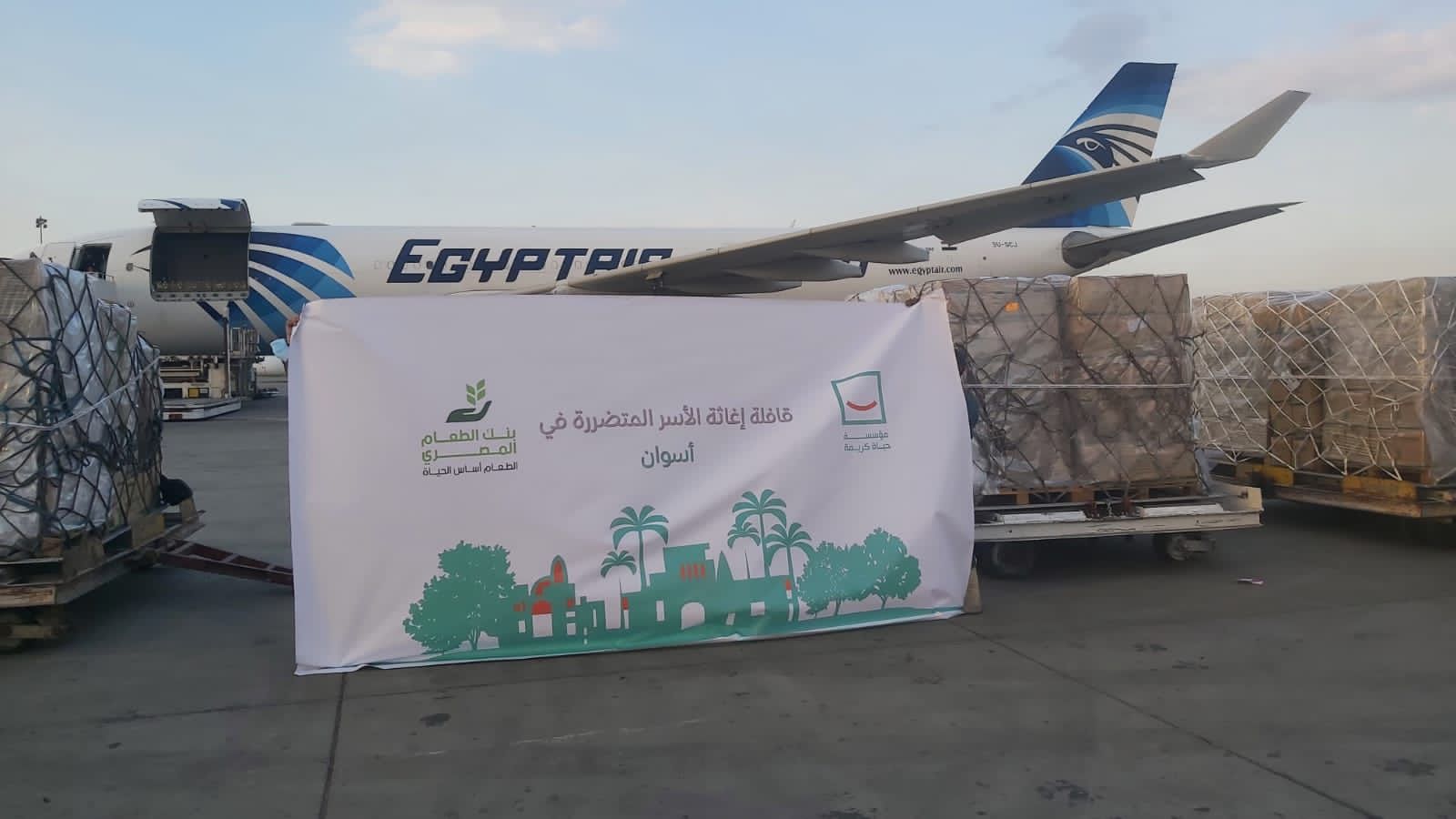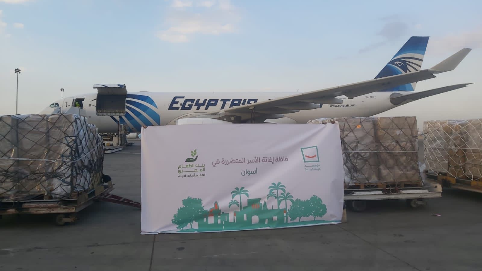 مؤسسة حياة كريمة ترسل طائرة محملة بالقوافل الغذائية إلى أهالي أسوان بالتعاون مع بنك الطعام المصري ومصر للطيران |صور