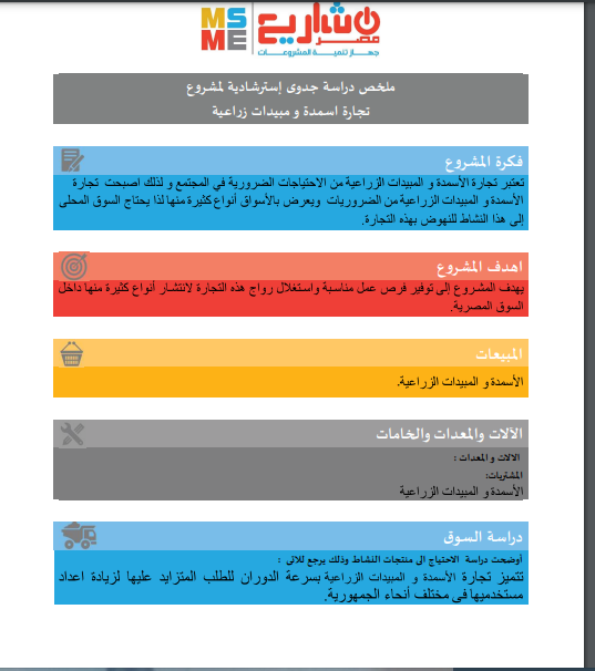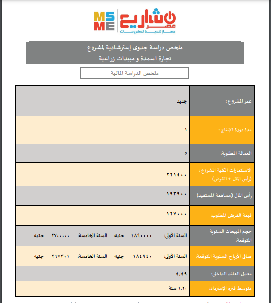 وتستعرض "فيتو" كافة التفاصيل المتعلقة بدراسة جدوي استرشادية لمشروع تجارة اسمدة ومبيدات زراعية والتي أعدها جهاز تنمية المشروعات الصغيرة والمتوسطة خلال السطور التالية: