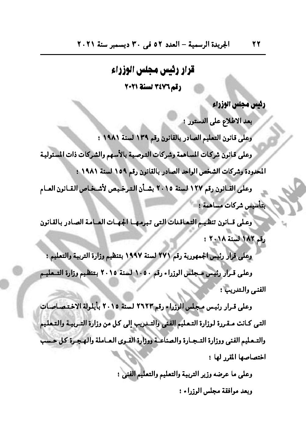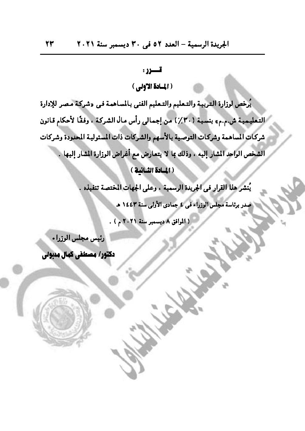 القرار رقم 3476 لسنة 2021، بالترخيص لوزارة التربية والتعليم والتعليم الفني بالمساهمة في "شركة مصر للإدارة التعليمية ش.م.م" بنسبة (30%) من إجمالي رأس مال الشركة، وفقًا لأحكام قانون شركات المساهمة وشركات التوصية بالأسهم والشركات ذات المسئولية المحدودة وشركات الشخص الواحد المشار إليه، وذلك بما لا يتعارض مع أغراض الوزارة المشار إليها.