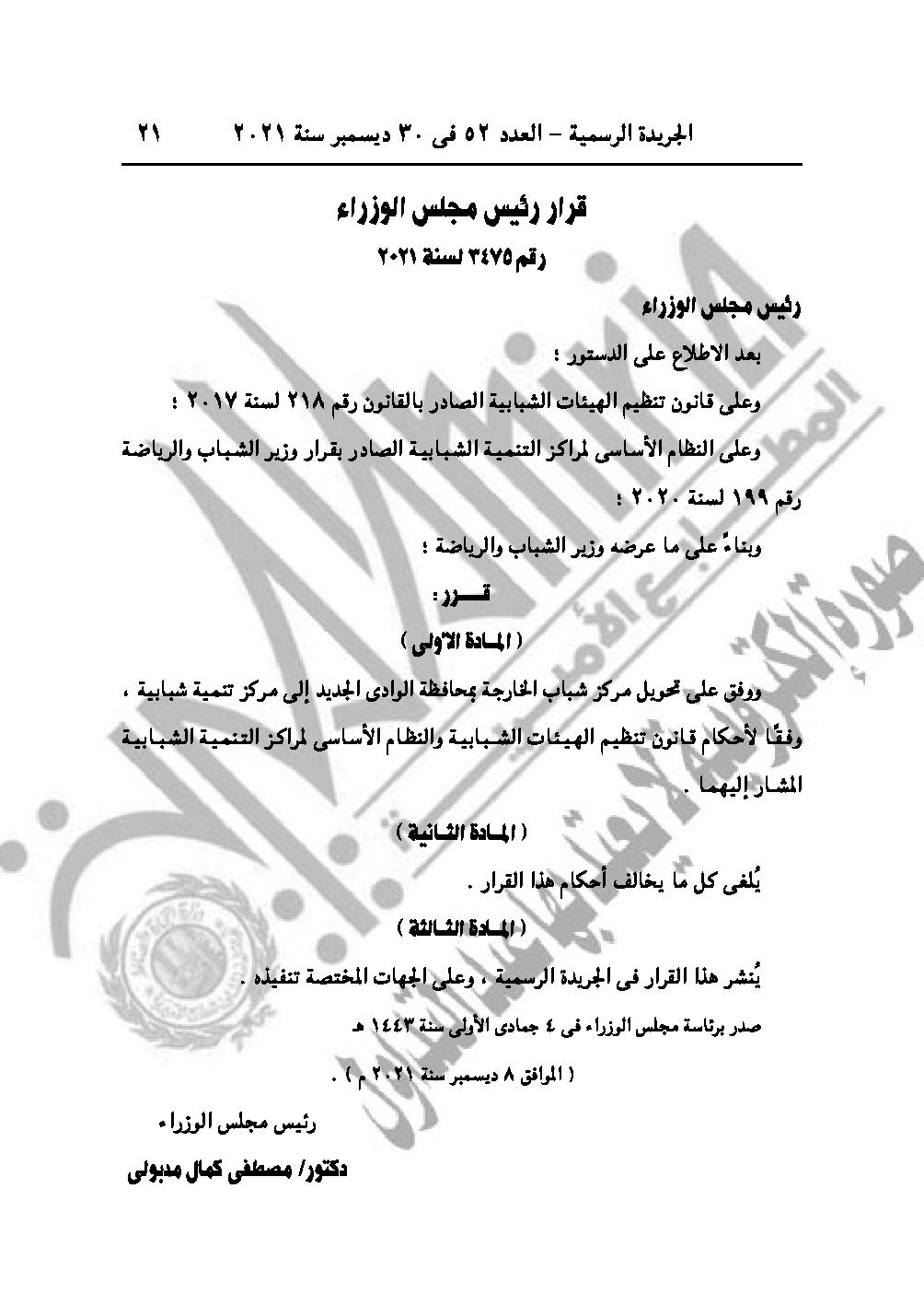 القرار رقم 3475 لسنة 2021، ووفق علي تحويل مركز شباب الخارجة بمحافظة الوادي الجديد إلي مركز تنمية شبابية، وفقًا لأحكام قانون تنظيم الهيئات الشـبابية والنظام الأساسي لمراكز التنمية الشبابية المشـار إليهمـا.