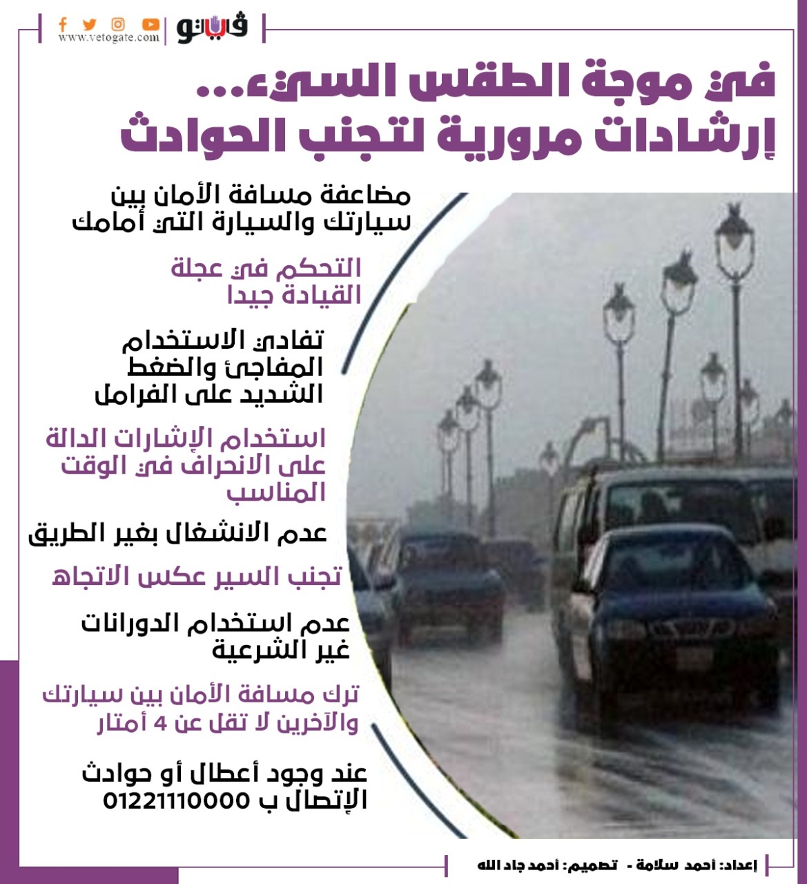 في موجة الطقس السيء... إرشادات مرورية لتجنب الحوادث | إنفوجراف الخميس 30/ديسمبر/2021 - 01:04 م 12/30/2021 1:04:28 PM 10 إرشادات مرورية لتجنب الحوادث أحمد سلامة شارك طباعة 18 حجم الخط شارك طباعة الطقس السيء موجة الطقس السئ ارشادات القيادة الآمنة ارشادات المرور لتجنب الحوادث اخبار الحوادث