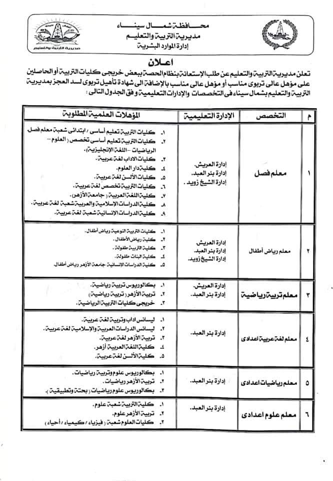 أعلنت مديرية التربية والتعليم بشمال سيناء عن طلب الاستعانة بنظام الحصة ببعض خريجي كليات التربية أو الحاصلين علي مؤهل عال تربوي مناسب أو مؤهل عال مناسب بالإضافة إلي شهادة تأهيل تربوي لسد العجز بالمديرية والإدارات التعليمية.