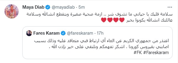 بعثت الفنانة اللبنانية مايا دياب رسالة دعم للمطرب اللبناني فارس كرم، الذي أعلن عن إصابته بفيروس كورونا، وعبرت عن تمنياته له ولأسرته بالصحة، قائلة: "سلامة قلبك يا حياتي ما تشوف شر"